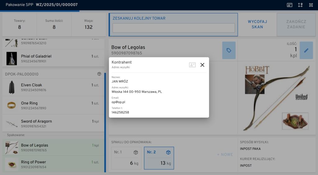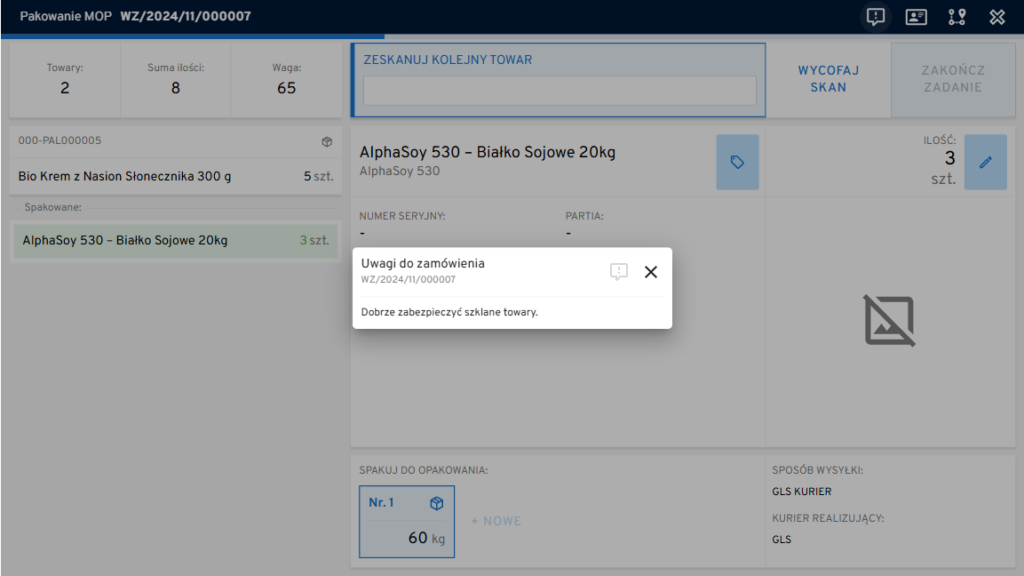 Obowiązkiem osoby pakującej jest pobranie kuwety/palety, zweryfikowanie poprawności znajdujących się w niej towarów, zabezpieczenie ich na czas wysyłki i wygenerowanie listu przewozowego (opcja nieobowiązkowa).