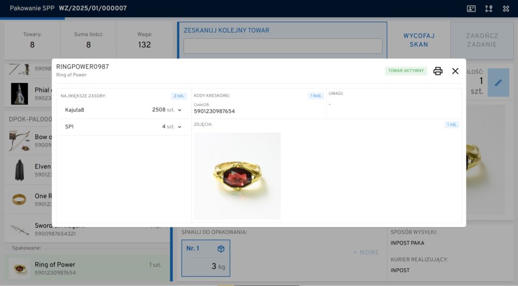 5. informacja o tym, które towary i w jakiej ilości zostały już spakowane (z miniaturami zdjęć z kartoteki).Jakie towary są w zadaniu jeszcze niespakowane i na jakich nośnikach (kuwetach) się znajdują. (Towary z miniaturami zdjęć z kartoteki.)