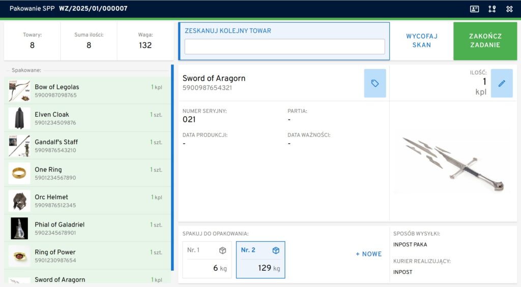 Po zapakowaniu wszystkich towarów z listy pojawia się zielony przycisk ZAKOŃCZ ZADANIE.