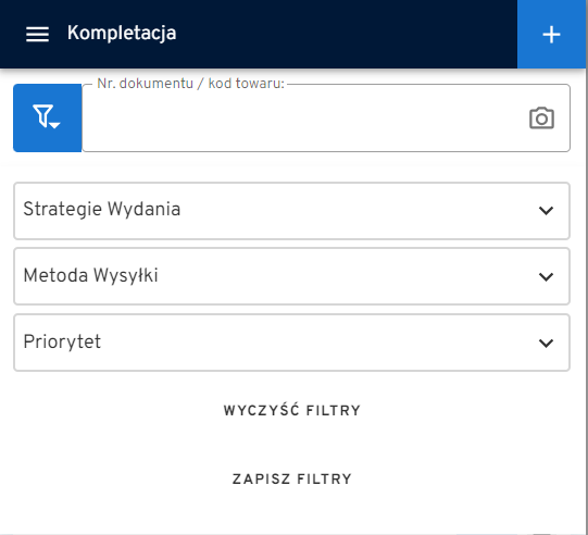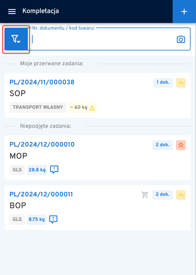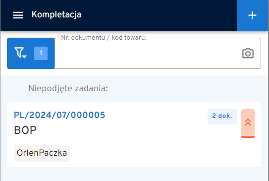 Zamówienia przekazane do realizacji (w aplikacji panelowej) pojawiają się na terminalu w zakładce KOMPLETACJA. Picking Listy posortowane są według priorytetów nadanych przez administratora lub kierownika magazynu.