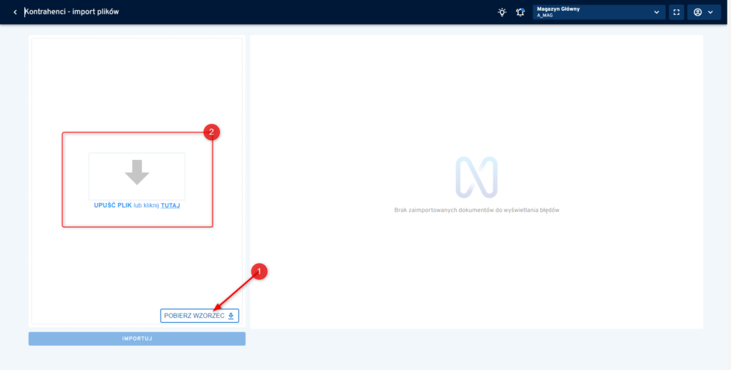 By tego dokonać, należy w oknie głównym importu nacisnąć przycisk WYBIERZ PLIK i wybrać go spośród plików znajdujących się w systemie (lub przeciągnąć i upuścić). Plik zostaje zaczytany, a użytkownik musi nacisnąć przycisk IMPORTUJ.