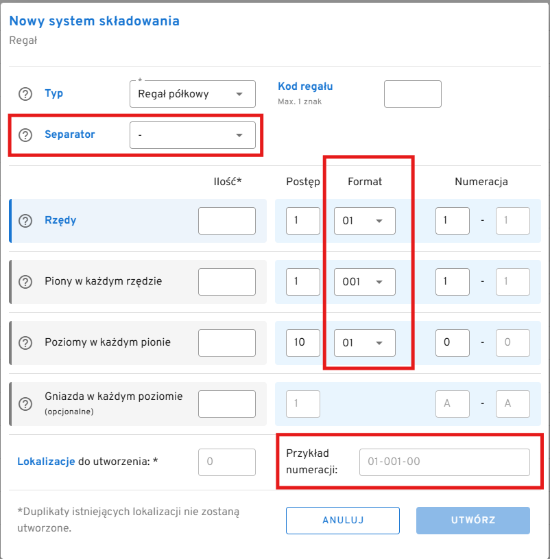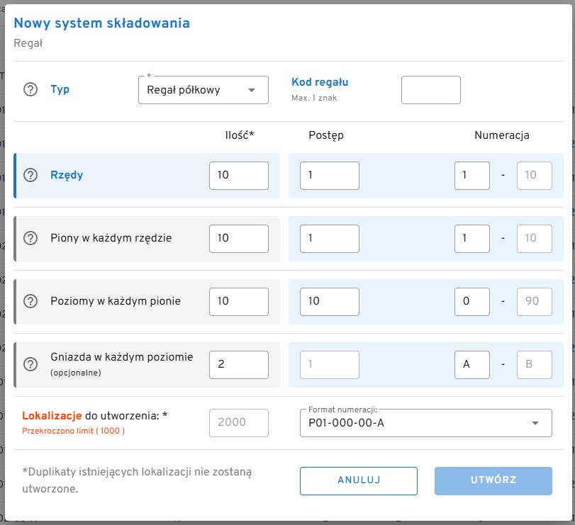 Użytkownik może zmienić zarówno początek numeracji, jak i postęp dla nowo tworzonych lokalizacji.