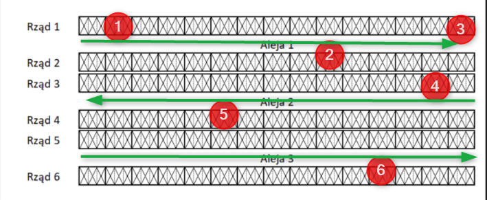• Aleja 3 (Rząd 5 i Rząd 6): Ścieżka prowadzi od lewej do prawej, co odpowiada kierunkowi rosnącemu numeracji lokalizacji.