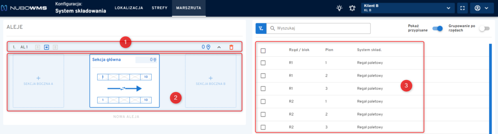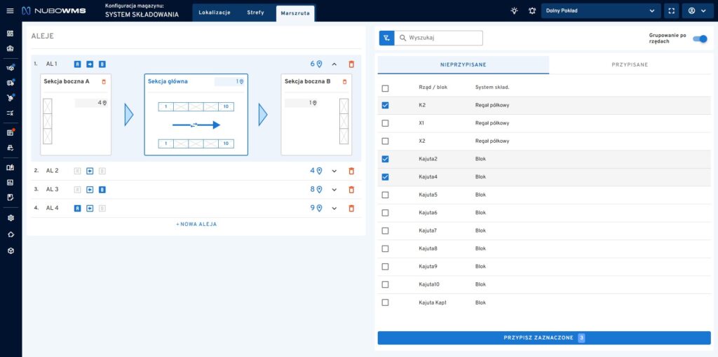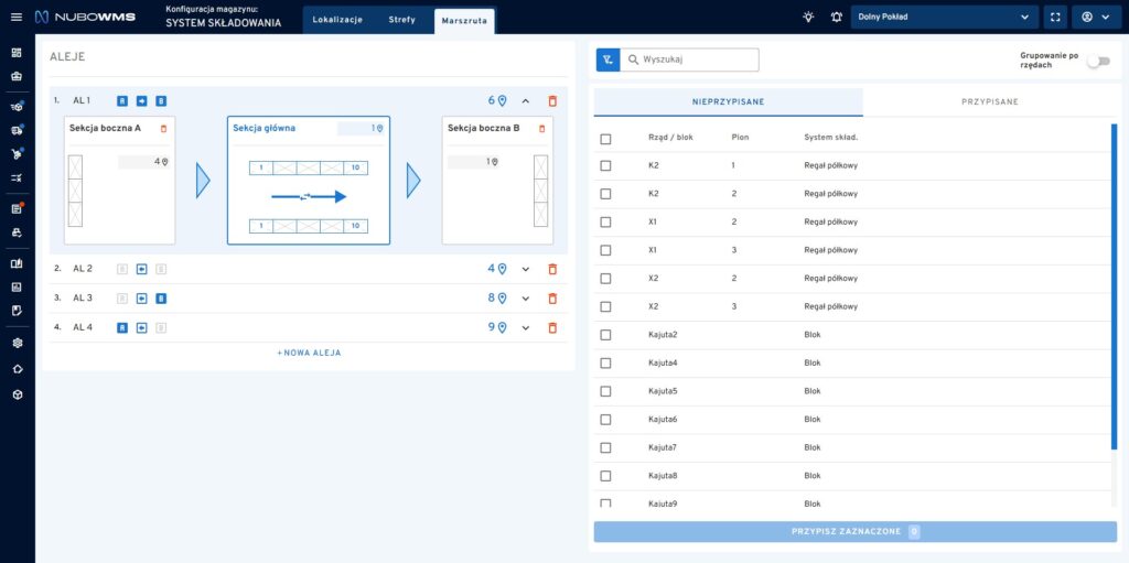 System NuboWMS umożliwia pełną edycję oraz usuwanie skonfigurowanych alei i sekcji bocznych. Każda zmiana w konfiguracji marszruty wpływa na ścieżkę zbiórki towarów w strefie kompletacji.