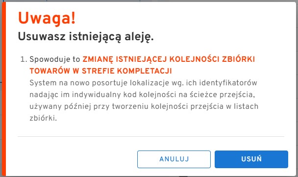 “Uwaga! Usuwasz istniejącą aleję.” “1. Spowoduje to ZMIANĘ ISTNIEJĄCEJ KOLEJNOŚCI ZBIÓRKI TOWARÓW W STREFIE KOMPLETACJI” “System na nowo posortuje lokalizacje wg. ich identyfikatorów nadając im indywidualny kod kolejności na ścieżce przejścia, używany później przy tworzeniu kolejności przejścia w listach zbiórki.”