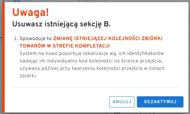 “Uwaga! Usuwasz istniejącą sekcję B.” “1. Spowoduje to ZMIANĘ ISTNIEJĄCEJ KOLEJNOŚCI ZBIÓRKI TOWARÓW W STREFIE KOMPLETACJI” “System na nowo posortuje lokalizacje wg. ich identyfikatorów nadając im indywidualny kod kolejności na ścieżce przejścia, używany później przy tworzeniu kolejności przejścia w listach zbiórki.”