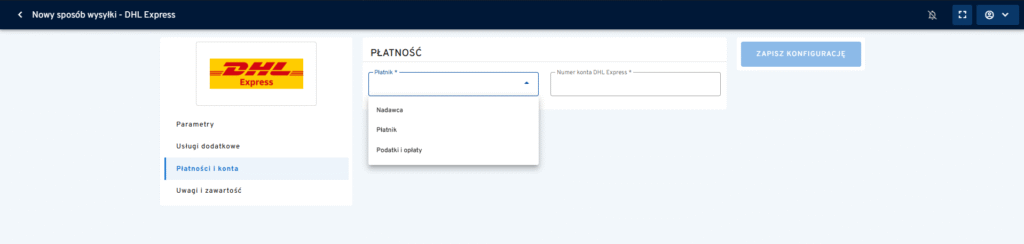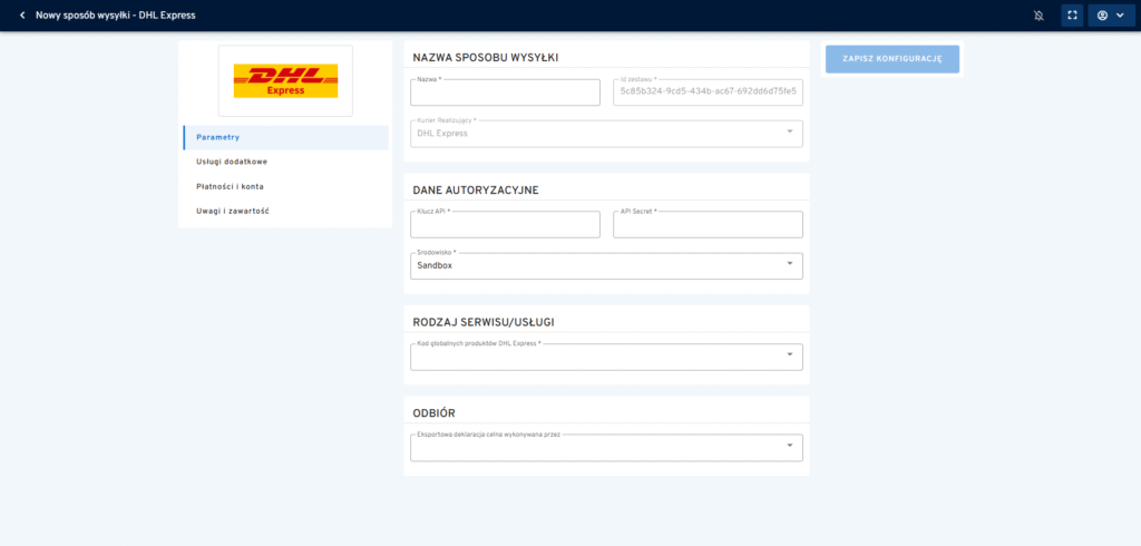 Dane autoryzacyjne – należy wprowadzić login oraz hasło służące do zalogowania się do serwisu DHL Express.