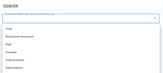 Odbiór – z listy należy wybrać przez kogo bedzie wykonywana deklaracja celna.