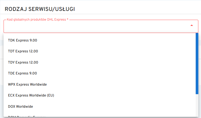 Rodzaj serwisu / usługi- z listy należy wybrać rodzaj usługi, oferowanej przez serwis kurierski.