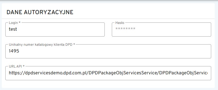 Dane autoryzacyjne – należy wprowadzić login oraz hasło służące do zalogowania się do serwisu DPD oraz unikalny numer katalogowy klienta DPD.