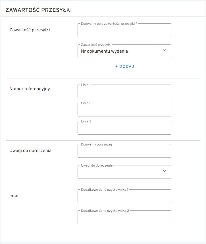 W tej zakładce można wprowadzić informacje, które przekazywane są do firmy kurierskiej, np. opis zawartości paczki oraz polach referencyjnych, które pomogą zidentyfikować paczkę, np. nazwa firmy, adres strony internetowej etc.