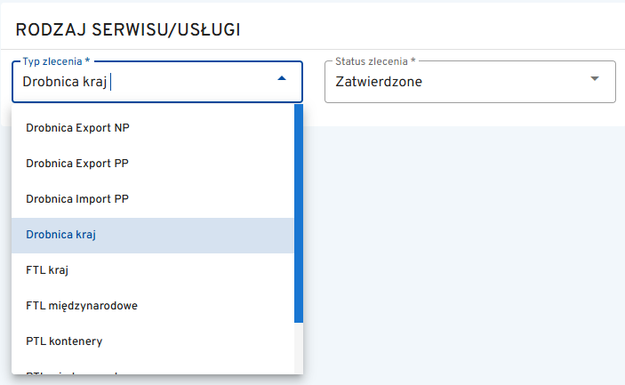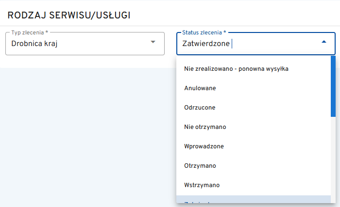 Rodzaj serwisu usługi – należy wybrać rodzaj przesyłki oraz status zlecenia.