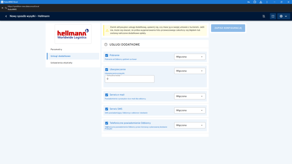 1. W tej zakładce można aktywować wybrane usługi dodatkowe, które będą wykorzystywane podczas wysyłki towarów do klientów.