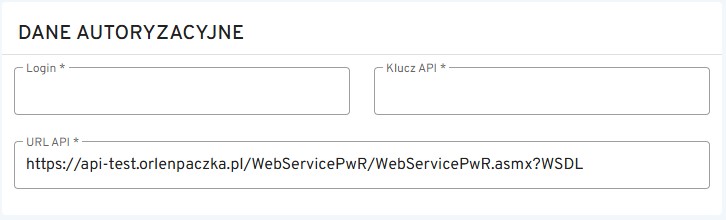Dane autoryzacyjne – należy wprowadzić login, służący do zalogowania się do serwisu ORLEN Paczki oraz klucz API (który można uzyskać po napisaniu do biura obsługi Orlen Paczki).