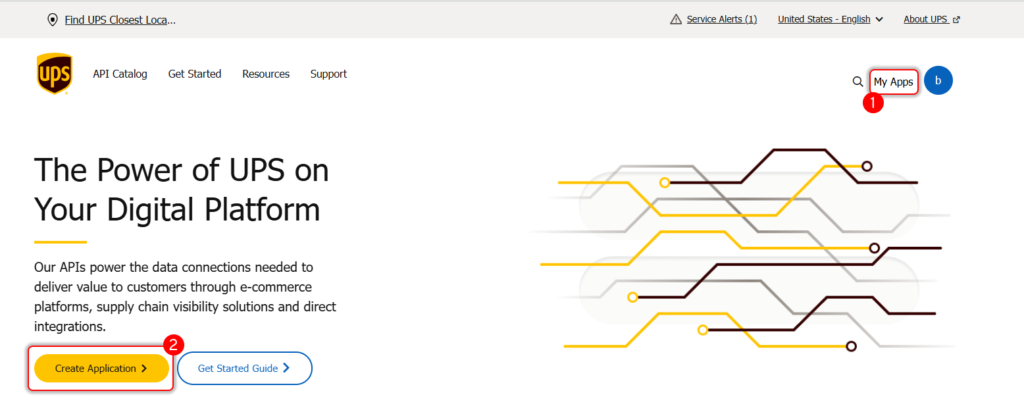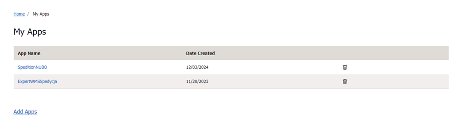 Żeby zarejestrować nową aplikację w serwisie UPS należy zalogować się na stronie UPS i wybrać „Add Apps” w – dolny lewy róg ekranu