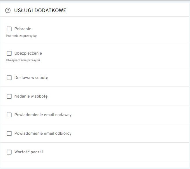 W tej zakładce można aktywować wybrane usługi dodatkowe, które będą wykorzystywane podczas wysyłki towarów do klientów.