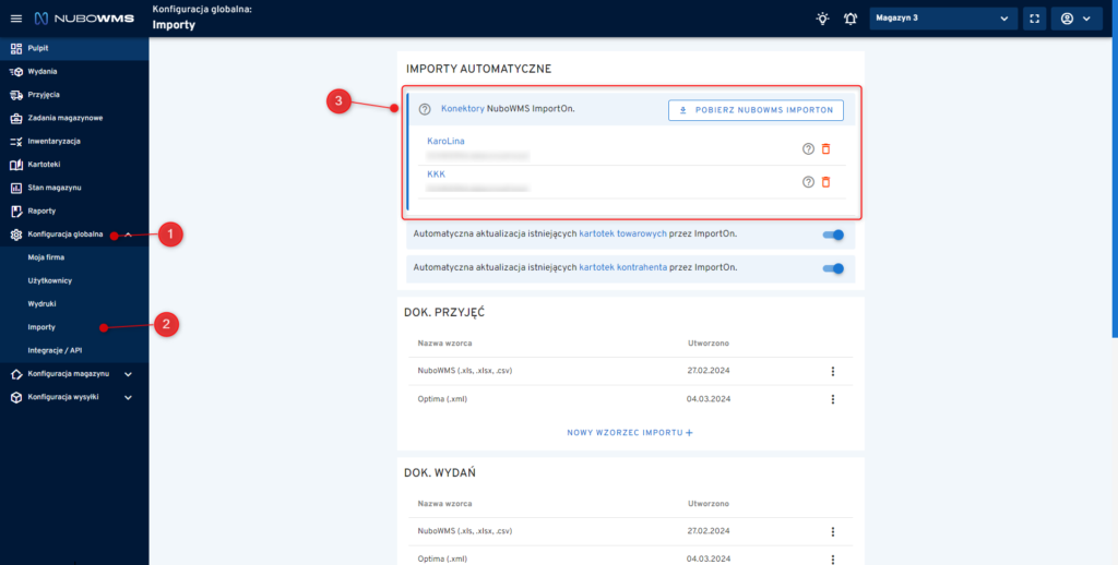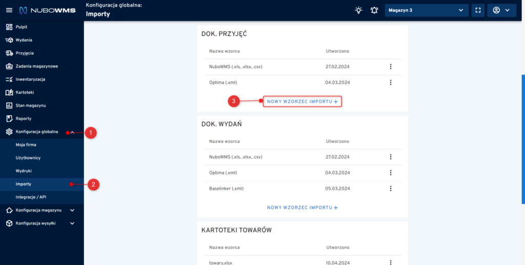 • szablony z systemu NuboWMS w formacie .xls (kartoteki, wydania, przyjęcia).