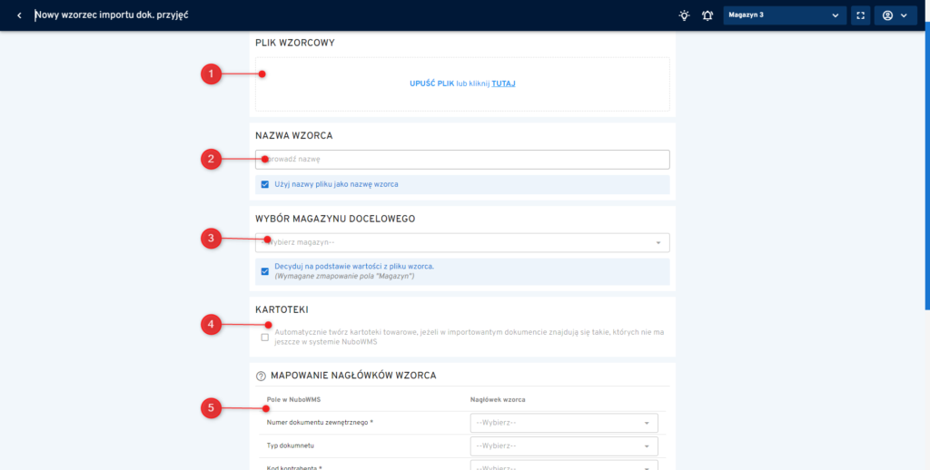 Wzorzec/szablon importu tworzony jest w systemie NuboWMS przy pomocy pliku z systemu zewnętrznego, który służy jako przykładowy (z pliku „czytana” jest struktura danych, a nie same dane).