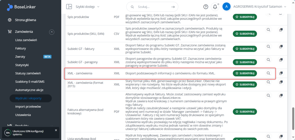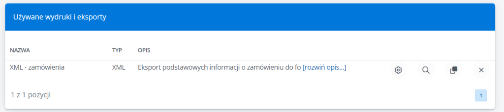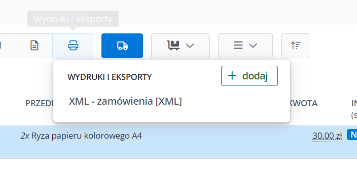 2. Następnie musimy odnaleźć na liście dostępnych wydruków i eksportów plik typu XML o nazwie -> XML ZAMÓWIENIA