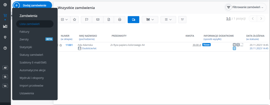 5. Teraz chcąc wyeksportować plik z zamówieniami w tym formacie wystarczy, że przeniesiemy się do zakładki ZAMÓWIENIA -> LISTA ZAMÓWIEŃ.
