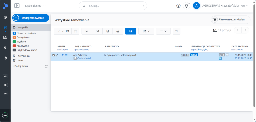 6. W głównej tabeli zaznaczamy zamówienia, które chcemy przekazać do systemu NuboWMS.