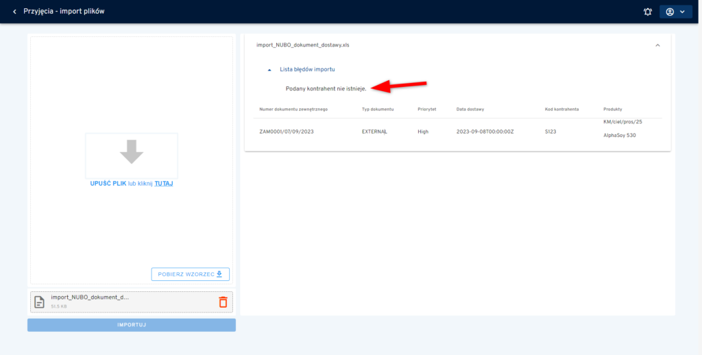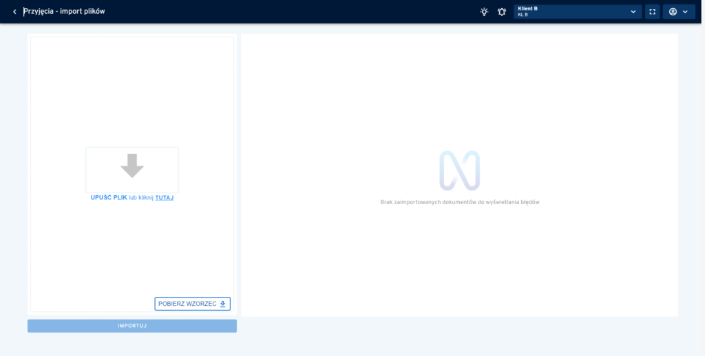 Po wybraniu wzorca, użytkownik w danym oknie importu ma możliwość zaimportowania pliku zgodnego z plikiem wzorcowym. Jeżeli użytkownik prześle plik niezgodny z szablonem importu (zdefiniowane wzorce), to system wyświetli błąd.