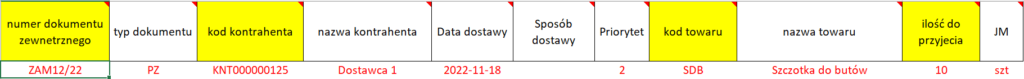 Wzorzec importu dokumentów przyjęć zawiera wiersz uzupełniony przykładowymi danymi. Należy pamiętać o tym, aby je usunąć.