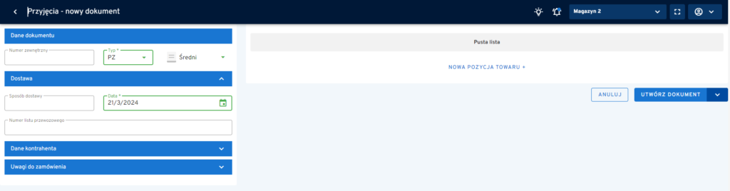 2. Pusta lista – tutaj dodajemy pozycje do dokumentu.