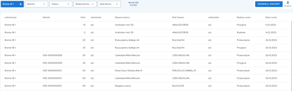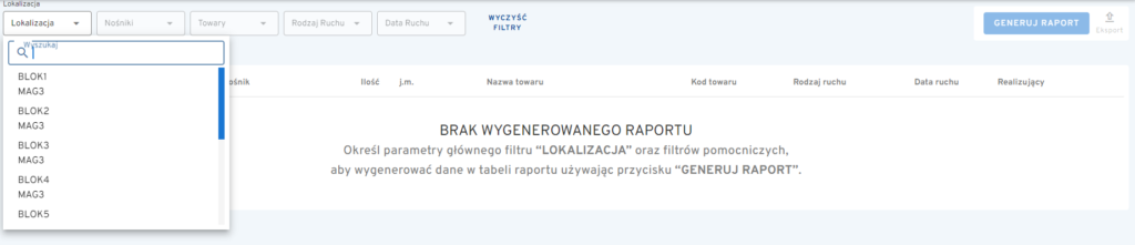Wygenerowanie raportu pozwoli zapoznać się ze wszystkimi ruchami powiązanymi z wybraną lokalizacją.