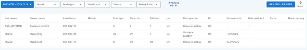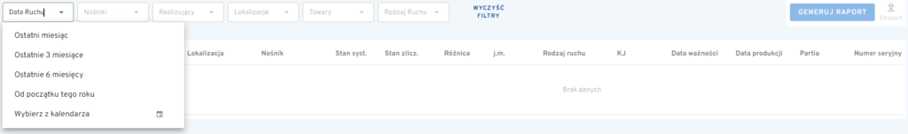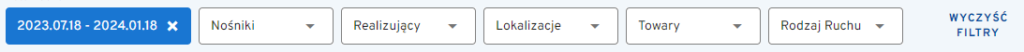 Chcąc zawęzić raport do konkretnego nośnika, towaru, rodzaju ruchu lub realizującego należy wykorzystać filtry i ponownie nacisnąć przycisk GENERUJ RAPORT.
