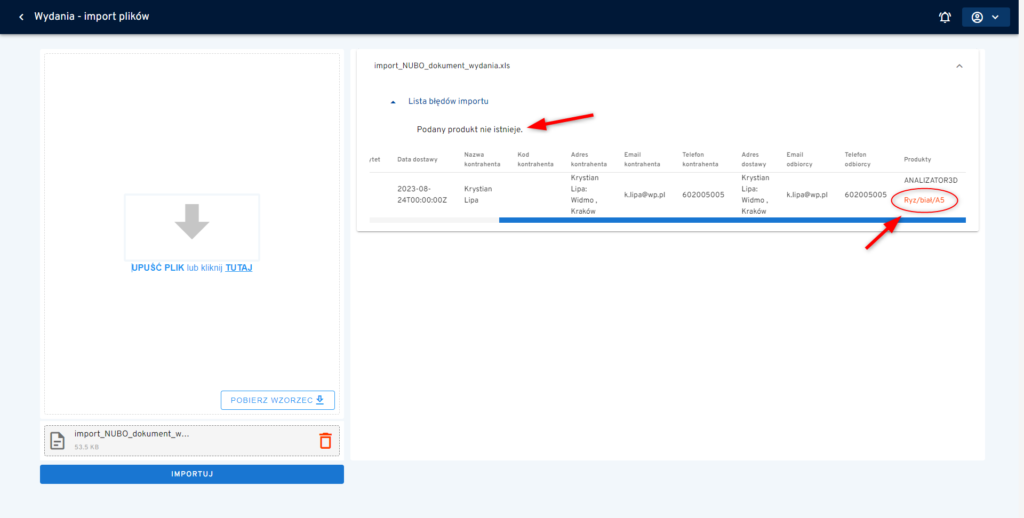 niezależnie od wybranej opcji importu, w przypadku wgrania pliku błędnie uzupełnionego system wyświetli informację o błędzie. Użytkownik zmuszony jest poprawić go i ponownie wgrać plik do systemu!
